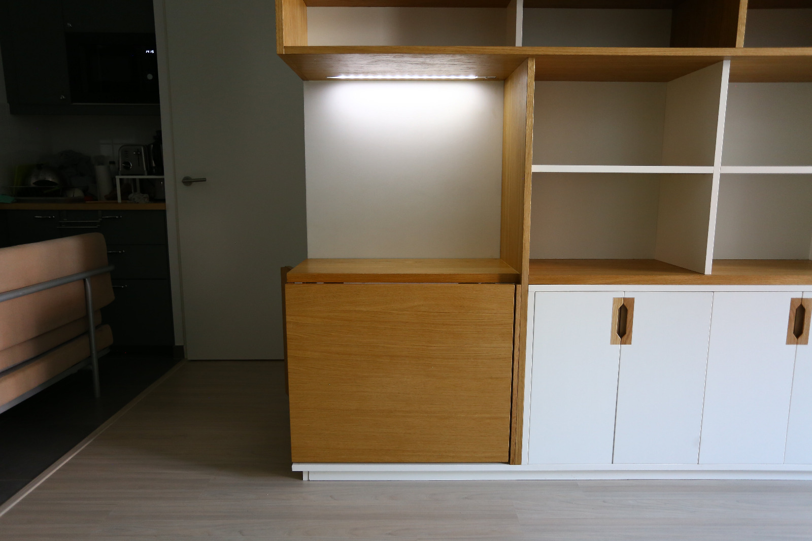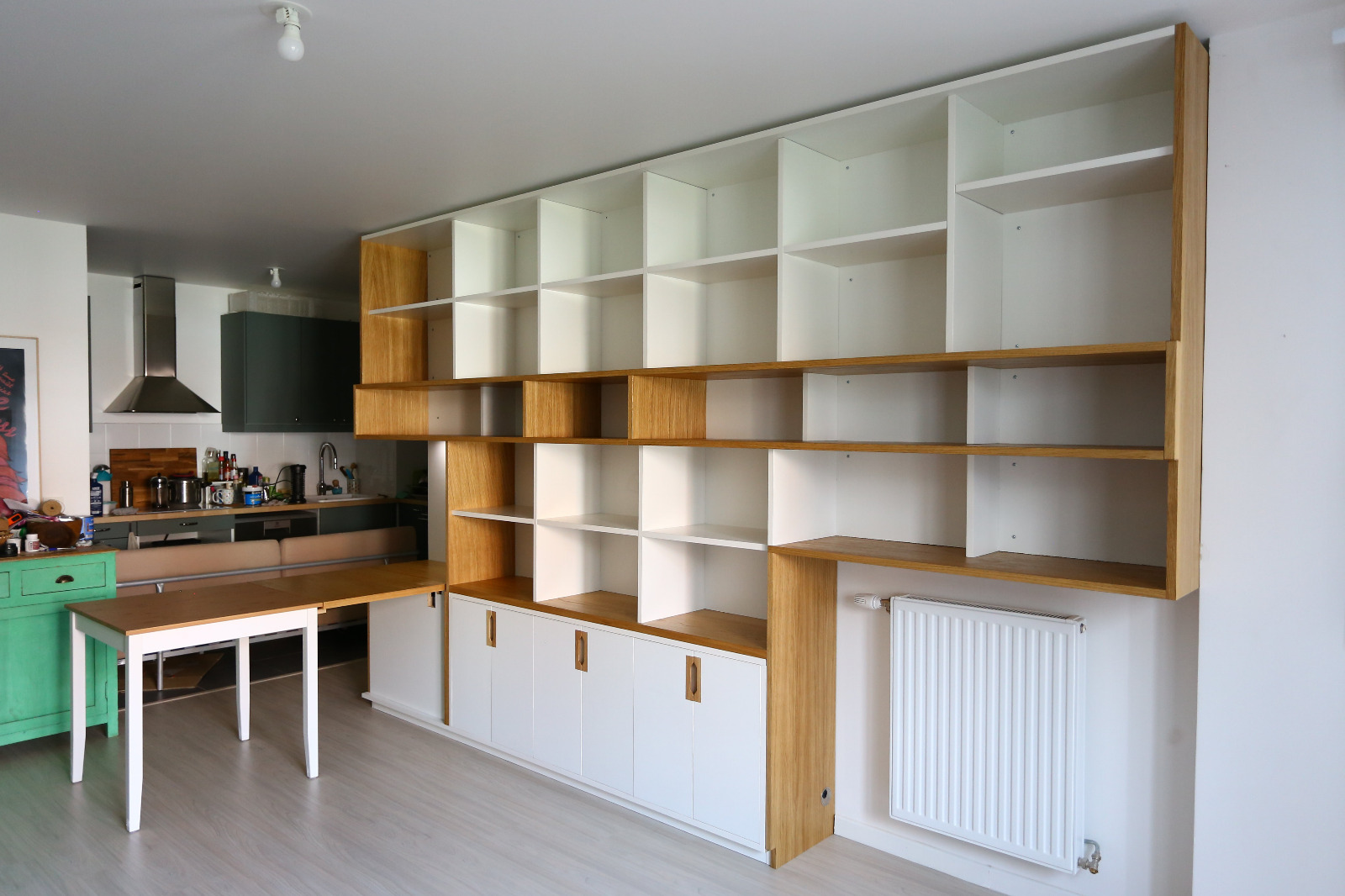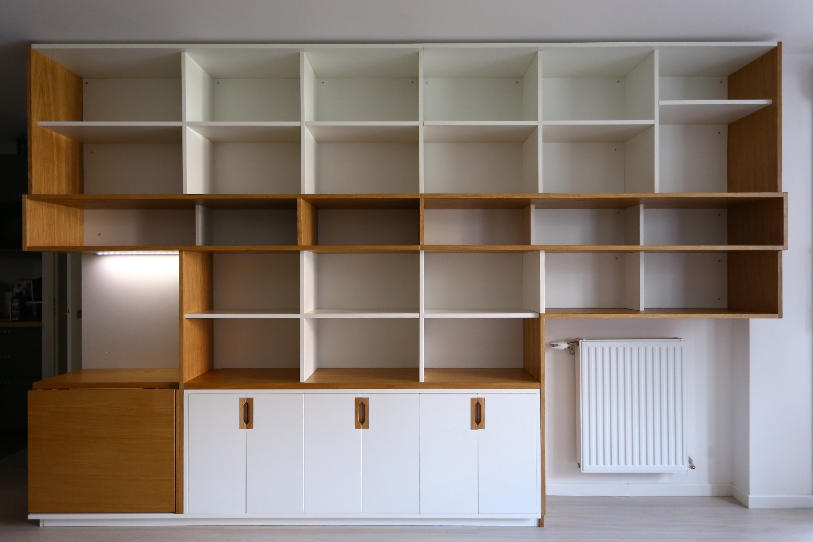Aurore travaille dans l’édition et Thibaut est passionné de BD et de musique, ils ont une petite fille de Dessin, conception et suivi de chantier pour cette bibliothèque de 4 mètres linéaire et 2,50m de haut. Intégration de nombreux rangements ouverts pour les livres et bandes dessinées, aménagement d’un espace à gauche et d’un plateau rabattable servant d’extension pour une table à manger. Éclairage via profilé LED intégré et télécommandé. Poignées usinées à la main en atelier.