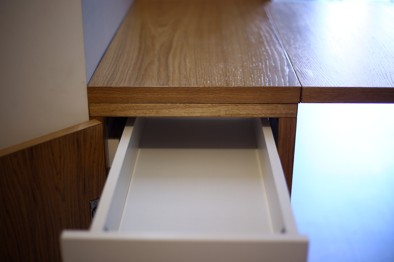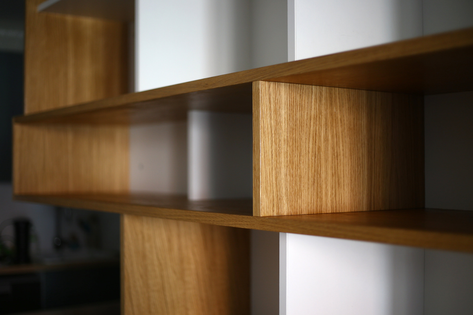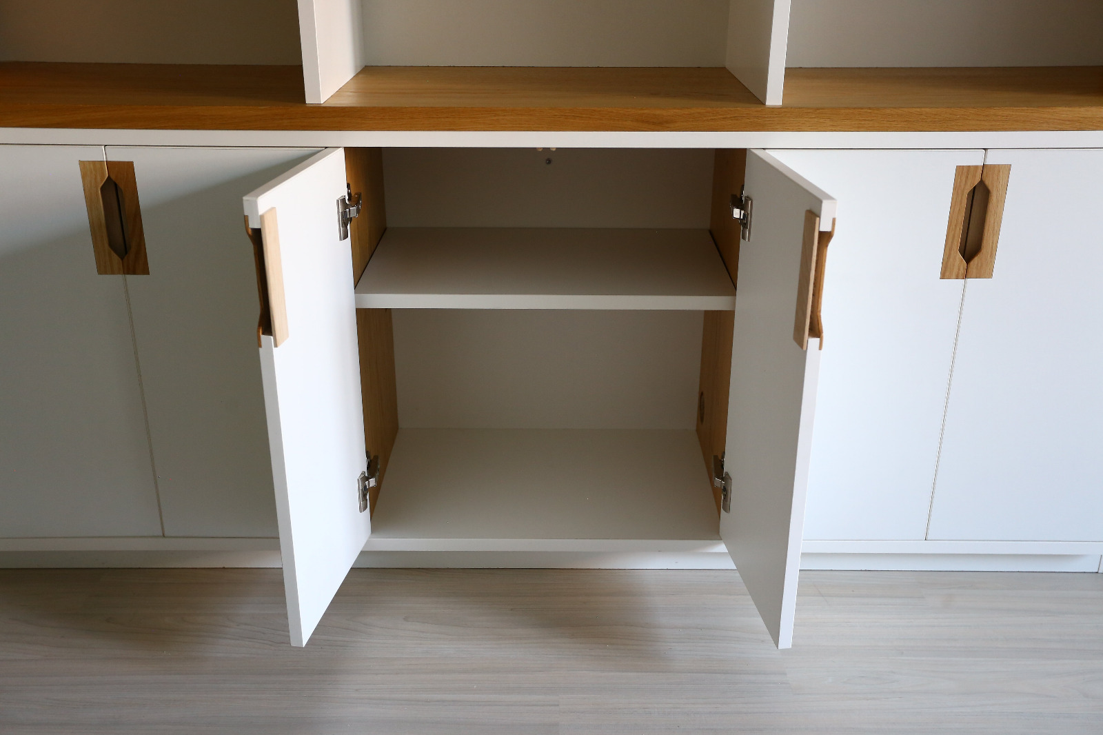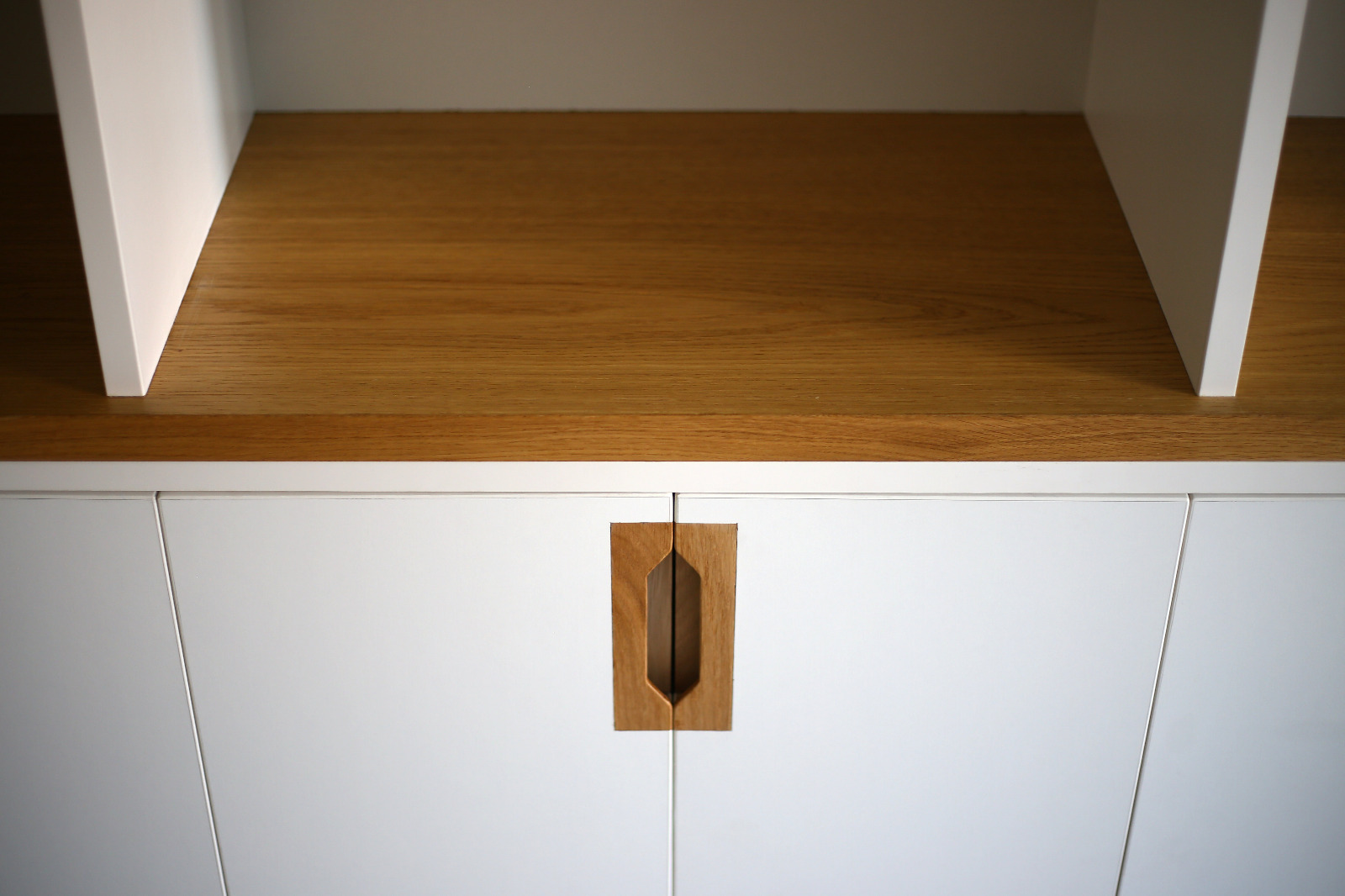 Aurore travaille dans l’édition et Thibaut est passionné de BD et de musique, ils ont une petite fille de Dessin, conception et suivi de chantier pour cette bibliothèque de 4 mètres linéaire et 2,50m de haut. Intégration de nombreux rangements ouverts pour les livres et bandes dessinées, aménagement d’un espace à gauche et d’un plateau rabattable servant d’extension pour une table à manger. Éclairage via profilé LED intégré et télécommandé. Poignées usinées à la main en atelier.