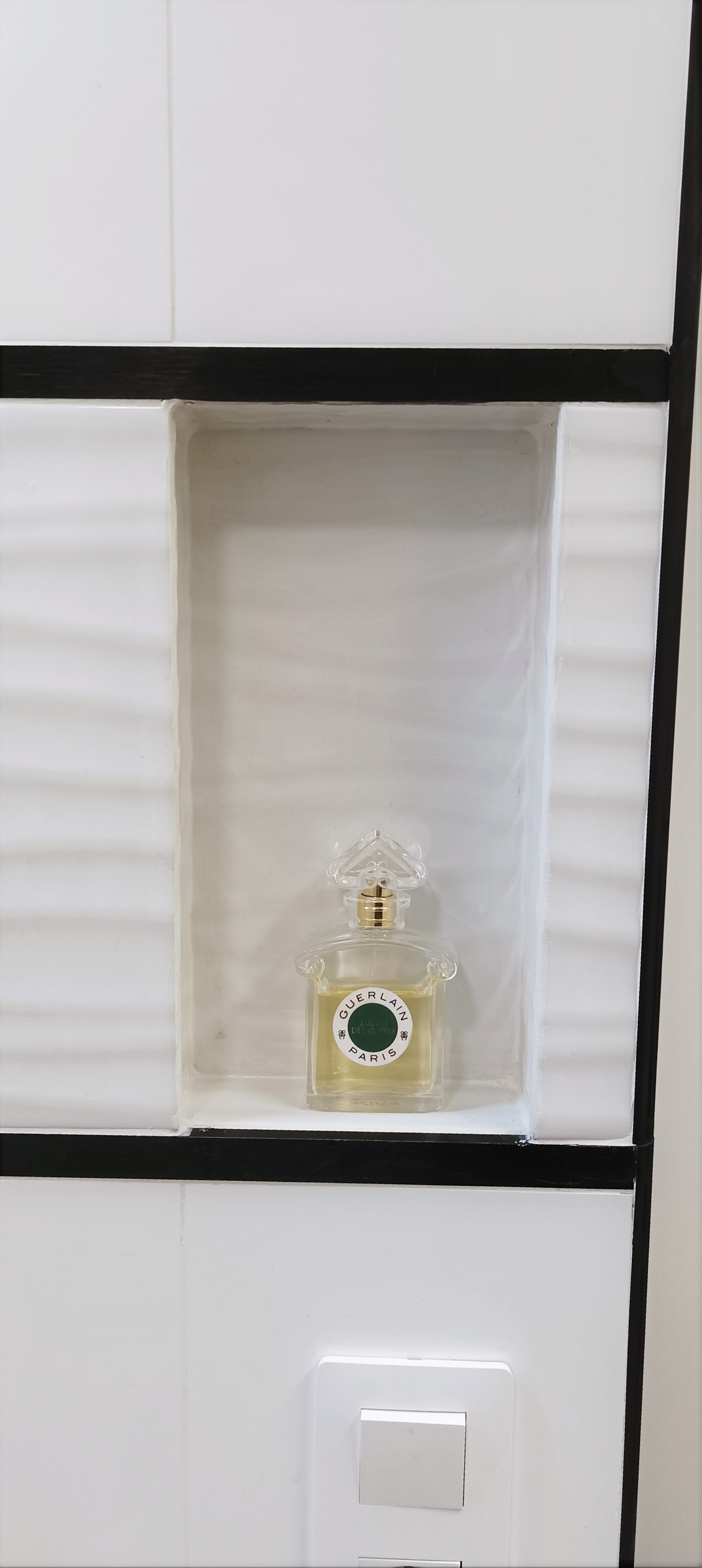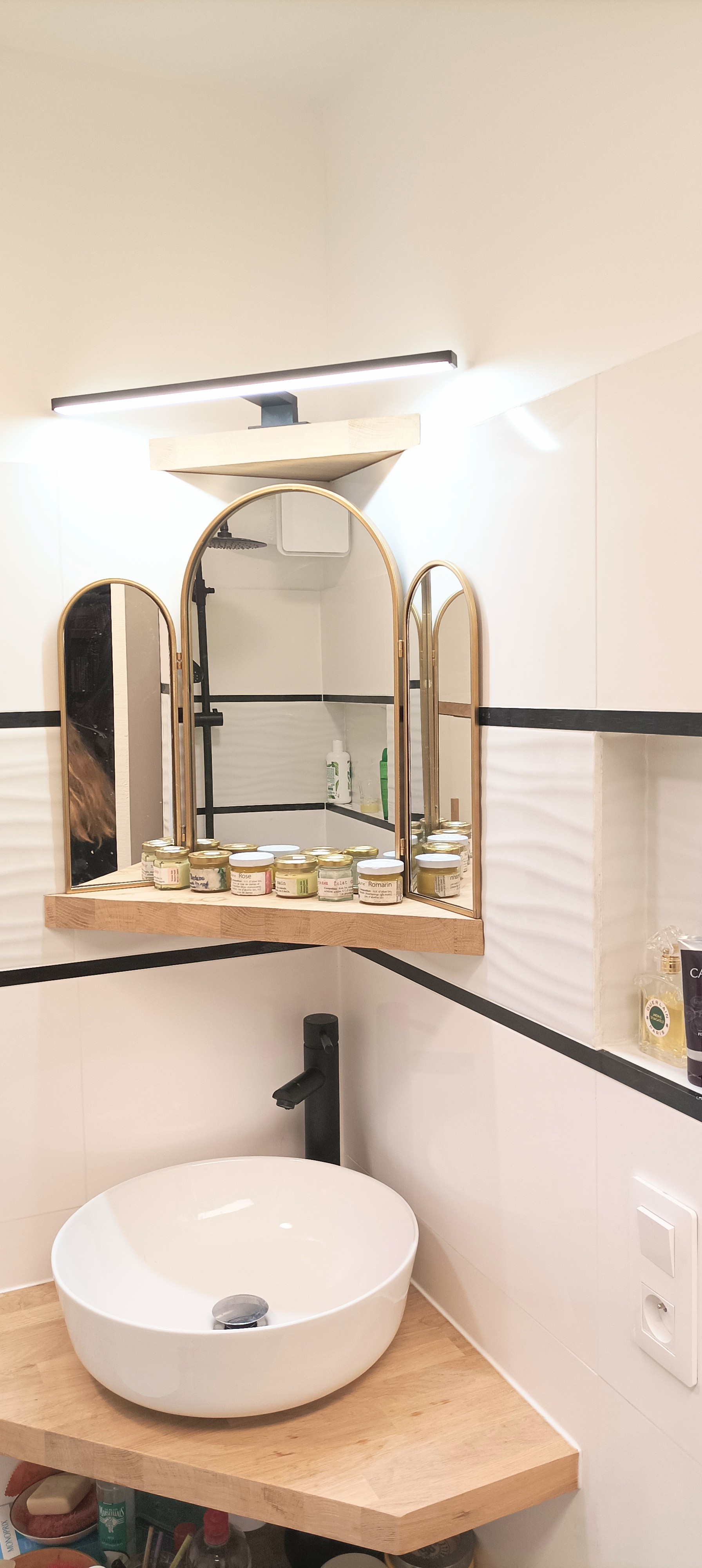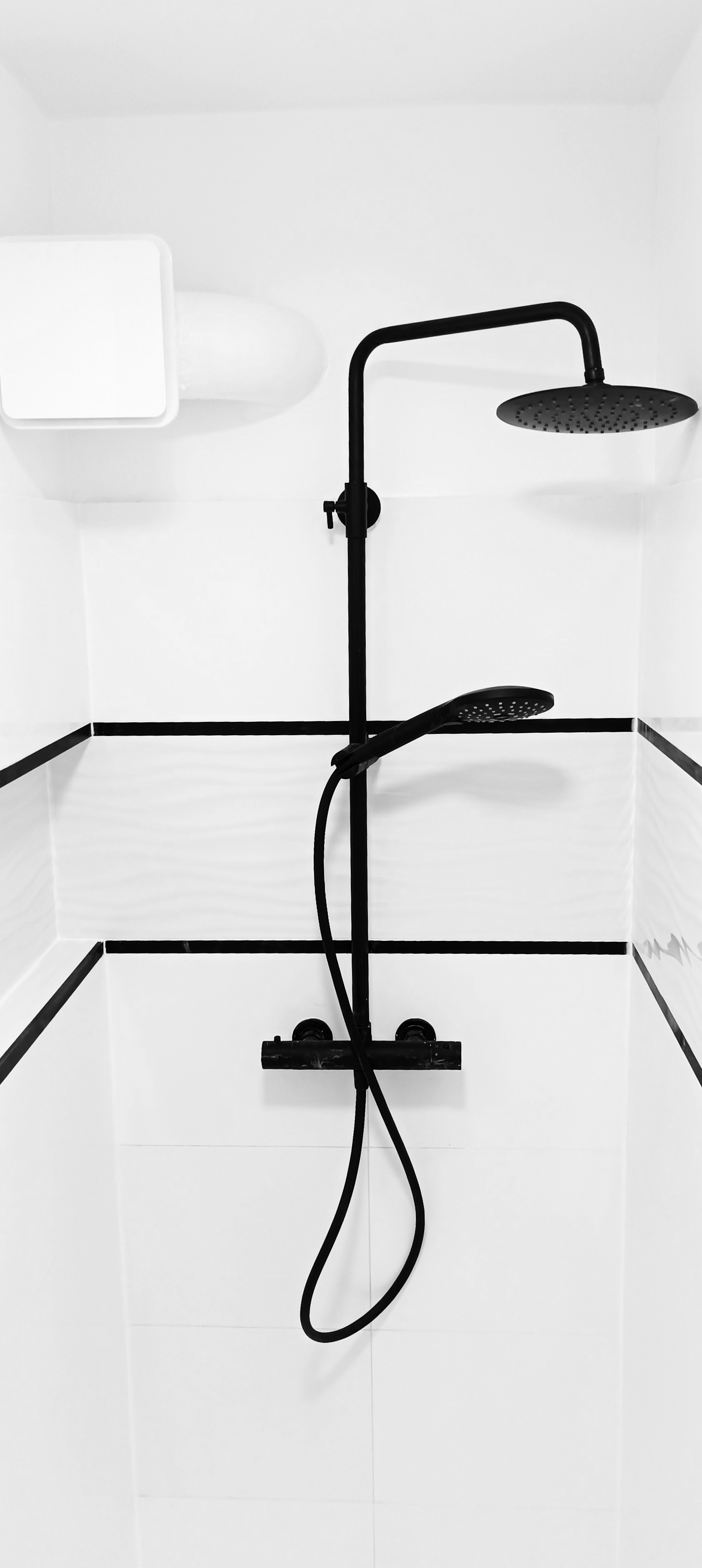 Une douche à l’italienne, entièrement carrelée en blanc lisse et blanc texturé et souligné de listel noir crée un nouvel espace minimaliste et cosy. Plusieurs niches permettent de mettre en avant les beaux objets et parfums pour personnaliser encore un peu plus le lieu.