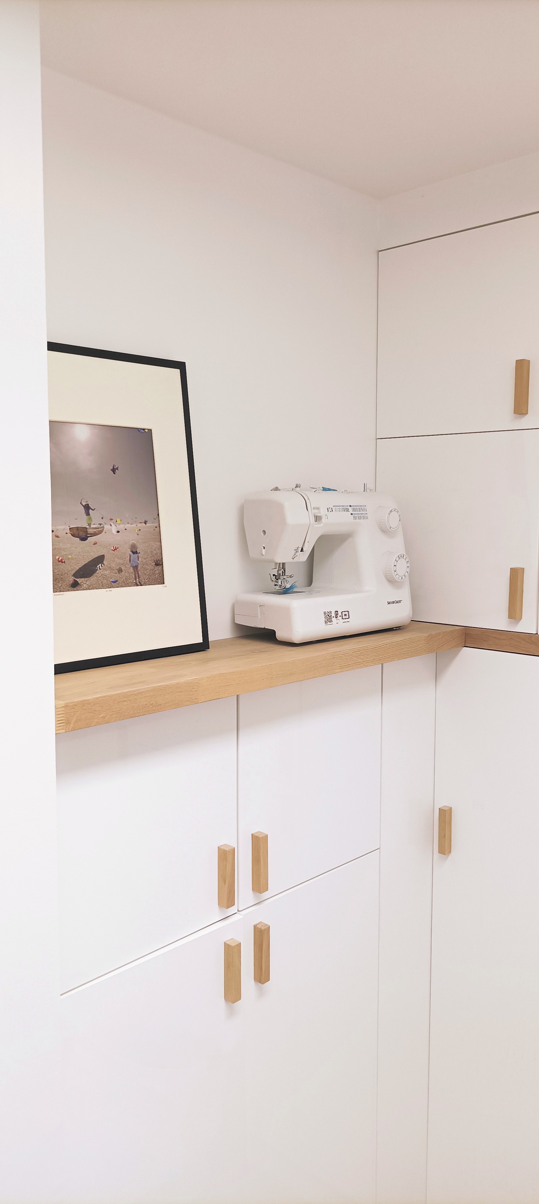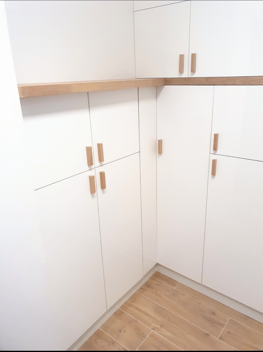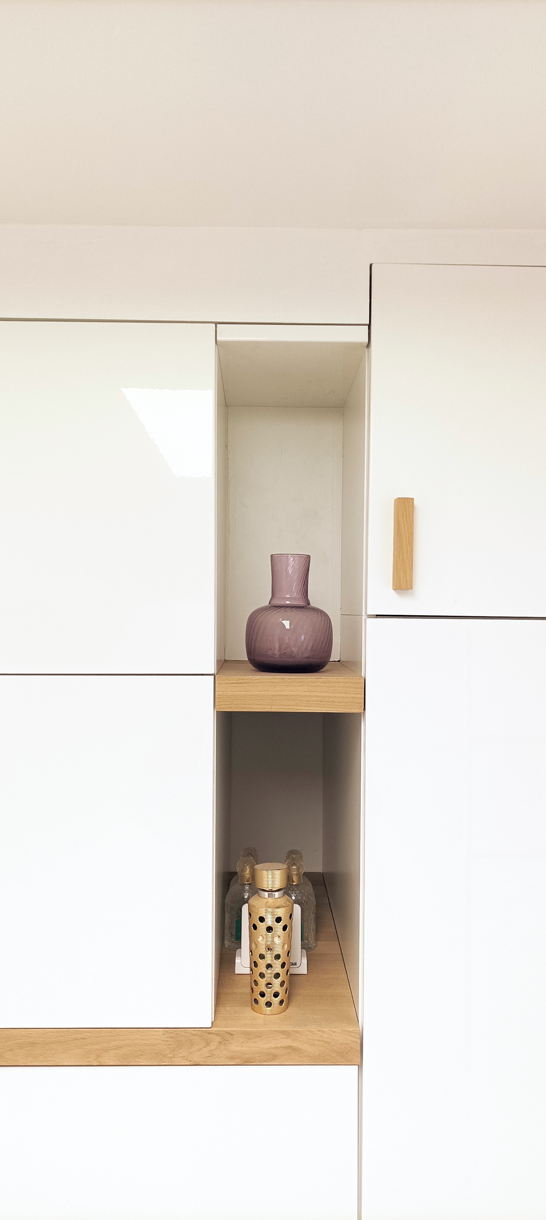 Des caissons de rangement Spaceo de profondeur différentes avec façades menuisées blanc brillant permettent de cacher le chauffe eau et de stocker l’encombrement le plus discrètement possible. Les panneaux en chêne de 35mm d’épaisseur viennent souligner les volumes et l’espace. Les poignées ont été menuisées à partir de tasseaux de chêne.