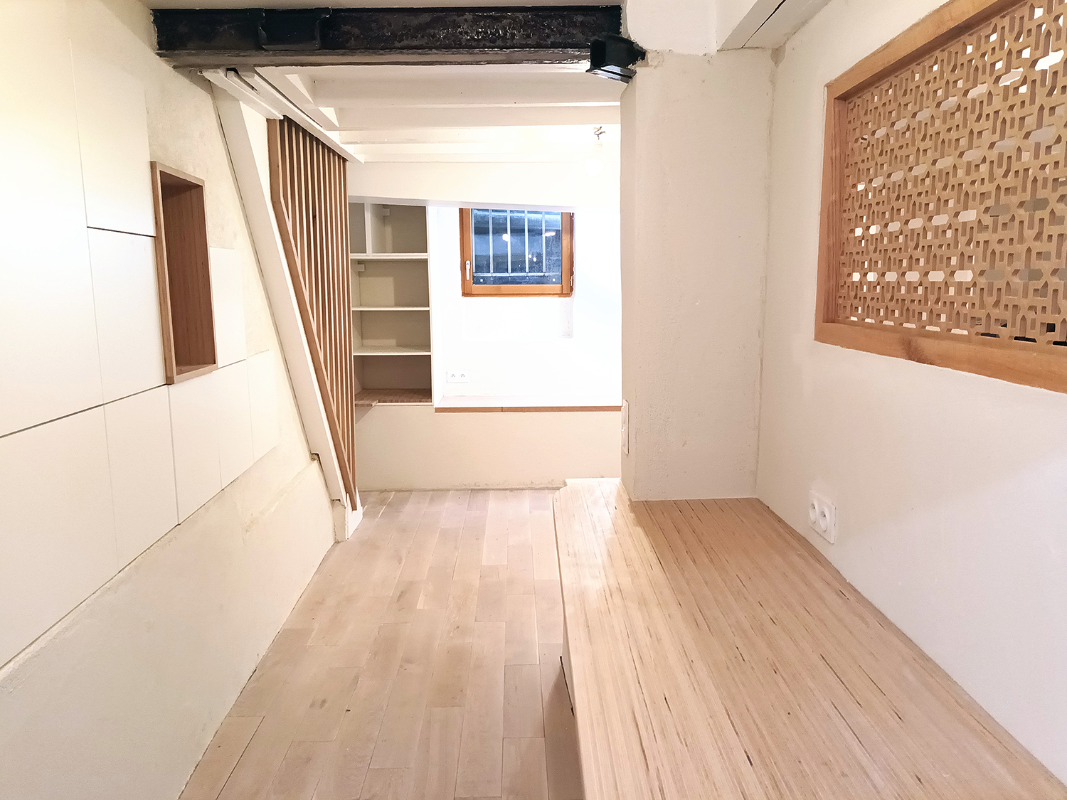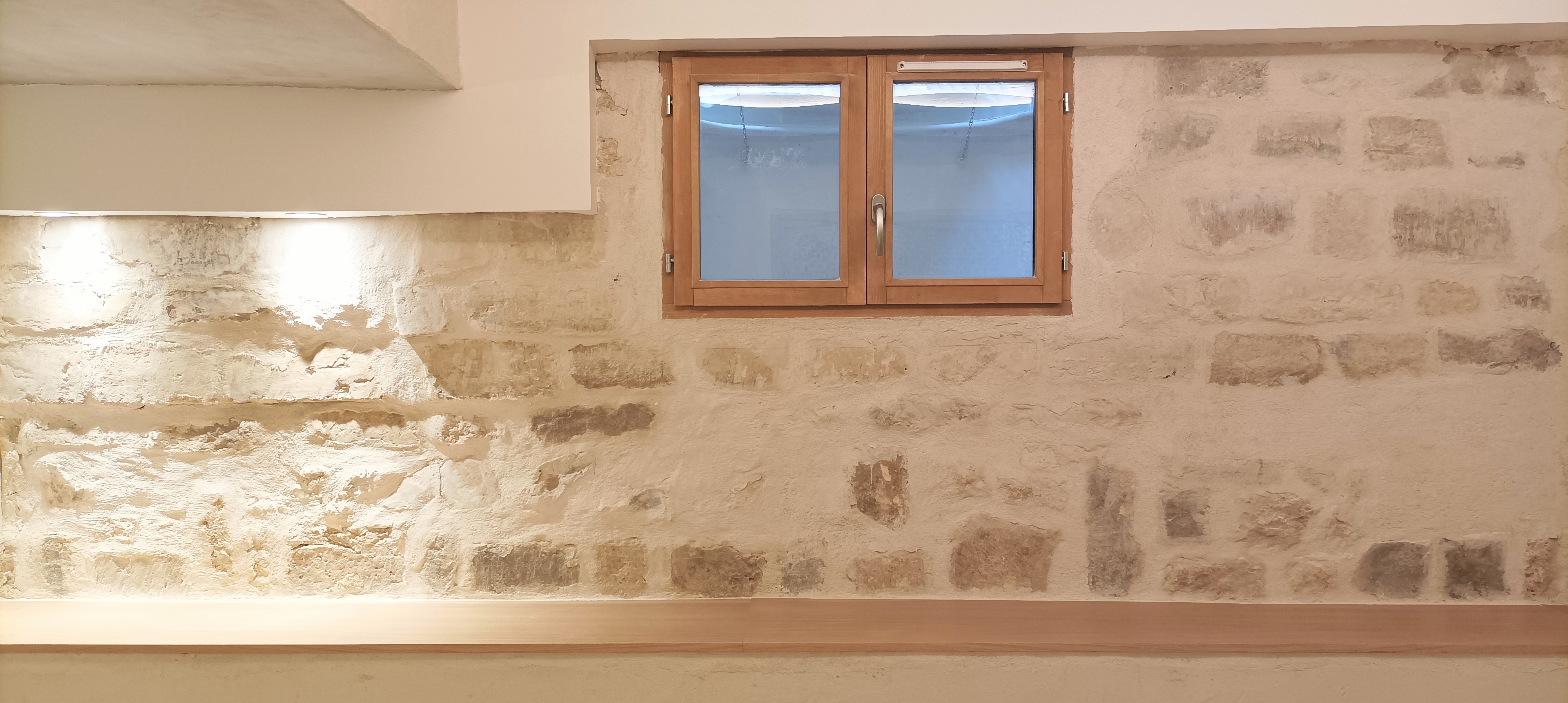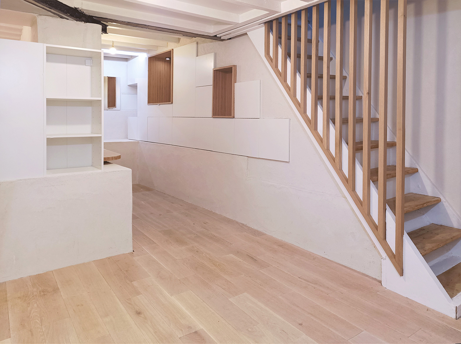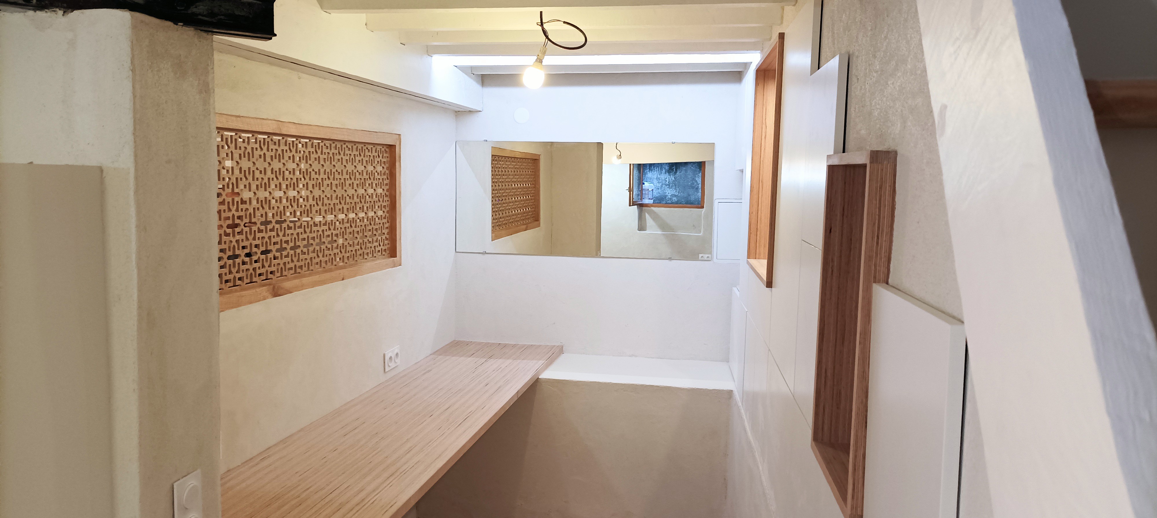 Dans leur maison à Paris dans le 20e arrondissement, avec 35m² environ de surface au sol, Lara et Pierre avait le projet de rendre habitable leur sous-sol déjà partiellement aménagé par les anciens propriétaires. La première contrainte était de se débarrasser de l’humidité qui remontait par capillarité et à travers les murs. L’autre challenge était de n’utiliser que des matériaux éco-responsables pour minimiser l’usage de produits chimiques. Le béton a été déposé de l’ensemble des murs qui ont été recouvert de chaux pour les laisser respirer. Cette opération a permis de mettre un jour un mur en pierre de taille dont les joints ont été repris à la chaux également. Les faux plafonds ont été déposés et les solives poncées puis peintes en blanc pour renforcer la hauteur sous plafond. Plusieurs coffrages et deux piliers d’un mètre carré, désormais inutiles, ont également été déposés pour gagner encore un peu d’espace. Enfin, le niveau du sol a pu être abaissé de 20cm pour gagner en hauteur sous plafond.