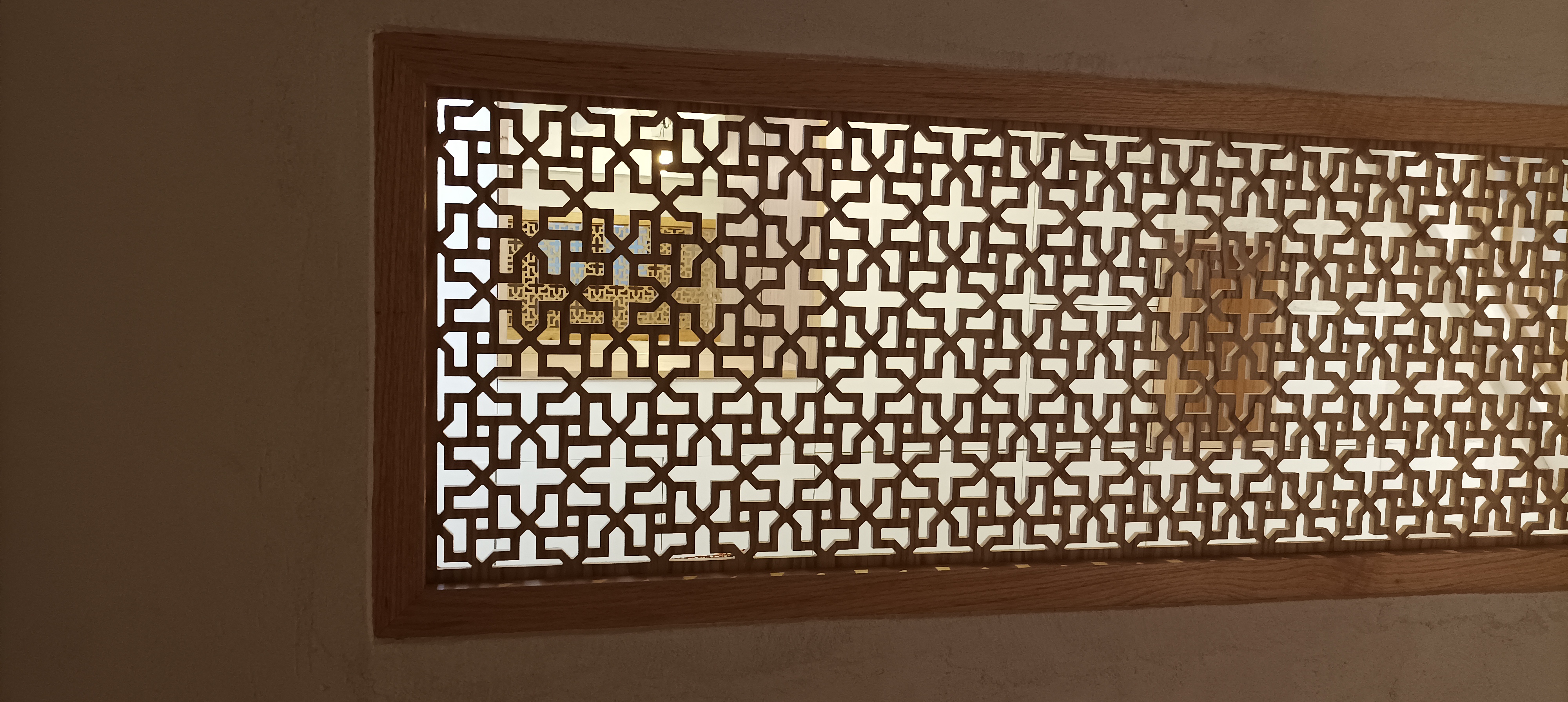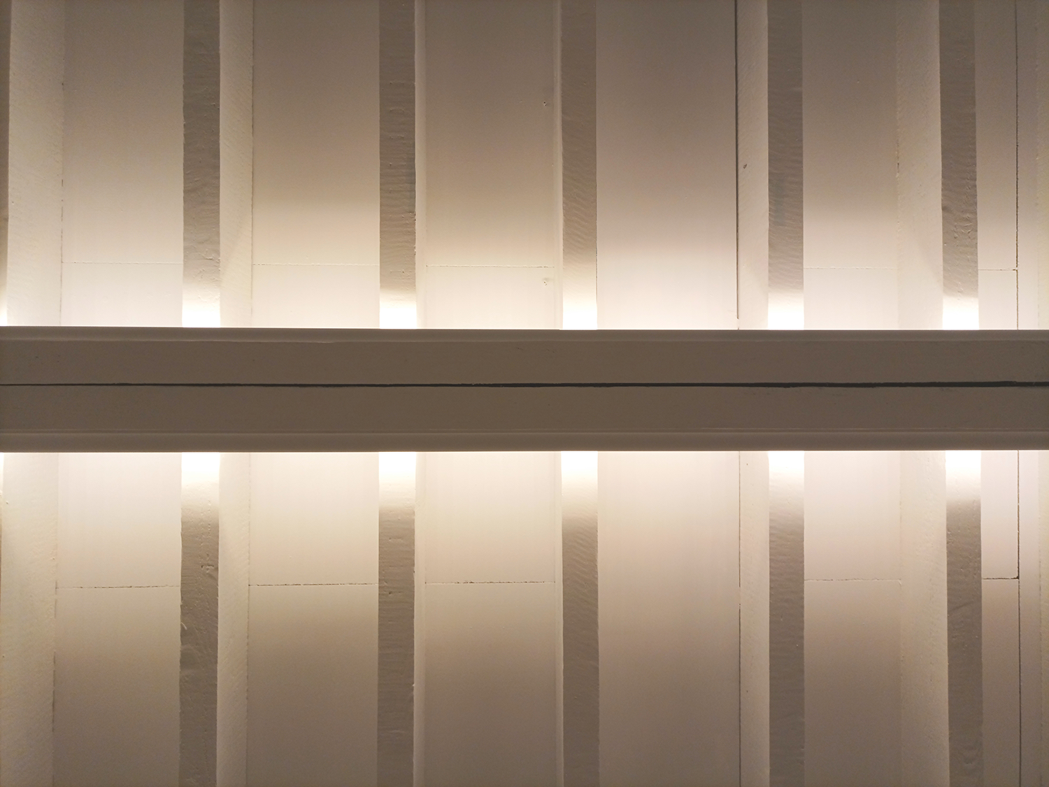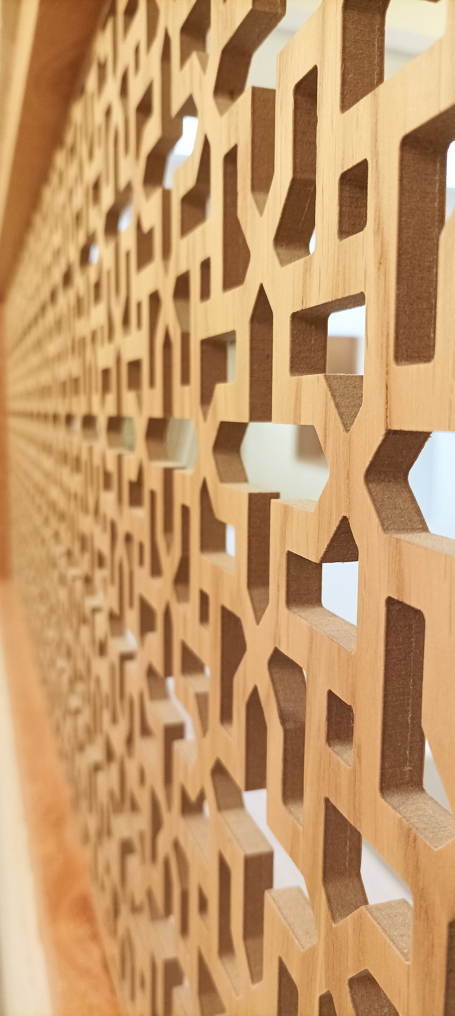 Côté menuiserie, le panneau ajouré entre le bureau et la chambre a été fait à la CNC sur un panneau de contreplaqué chêne. Le bureau, certains caissons et les assises sont en baubuche multiligne pour accentuer les lignes et les points de fuite. La rambarde d’escalier et les panneaux de finition dans la chambre sont en chêne massif et permettent de créer différents espace, différentes ambiances.