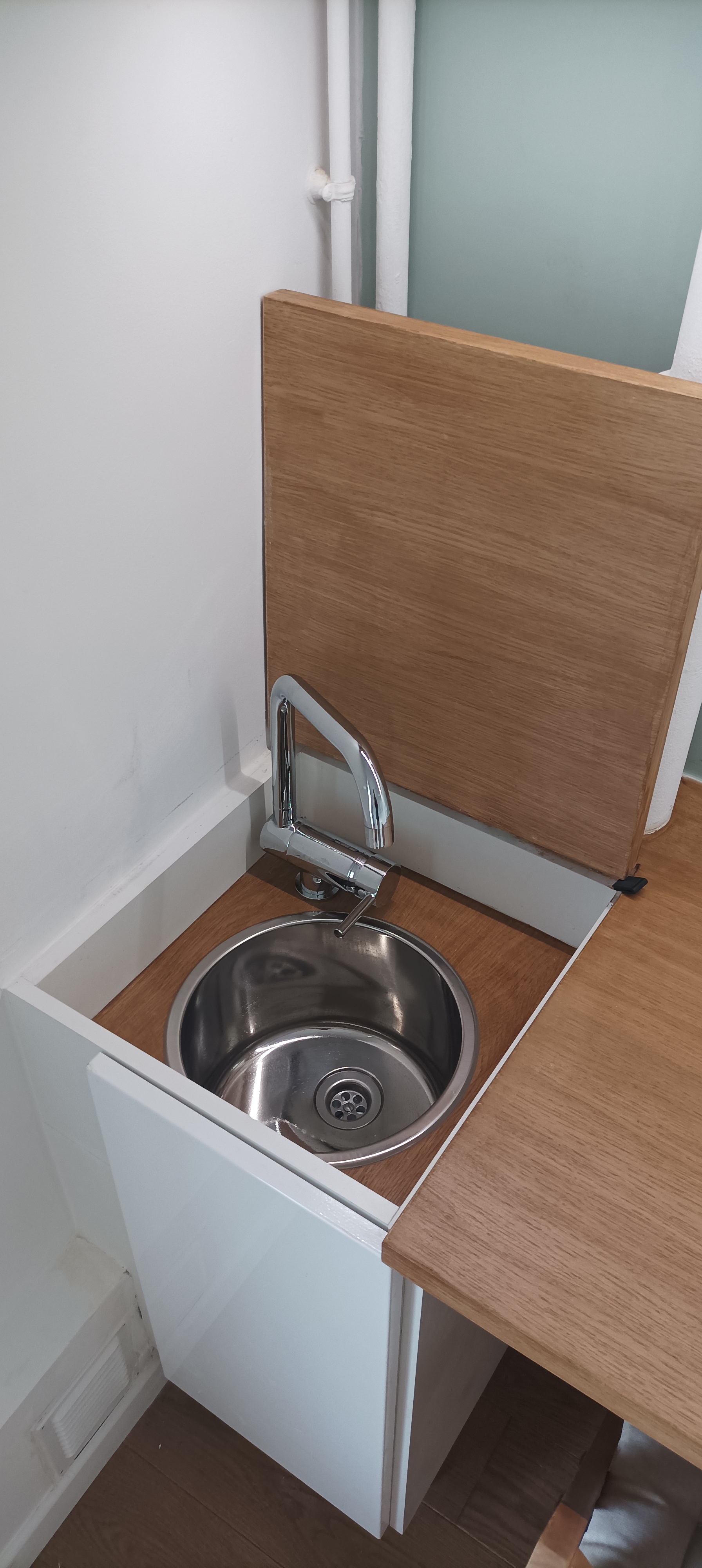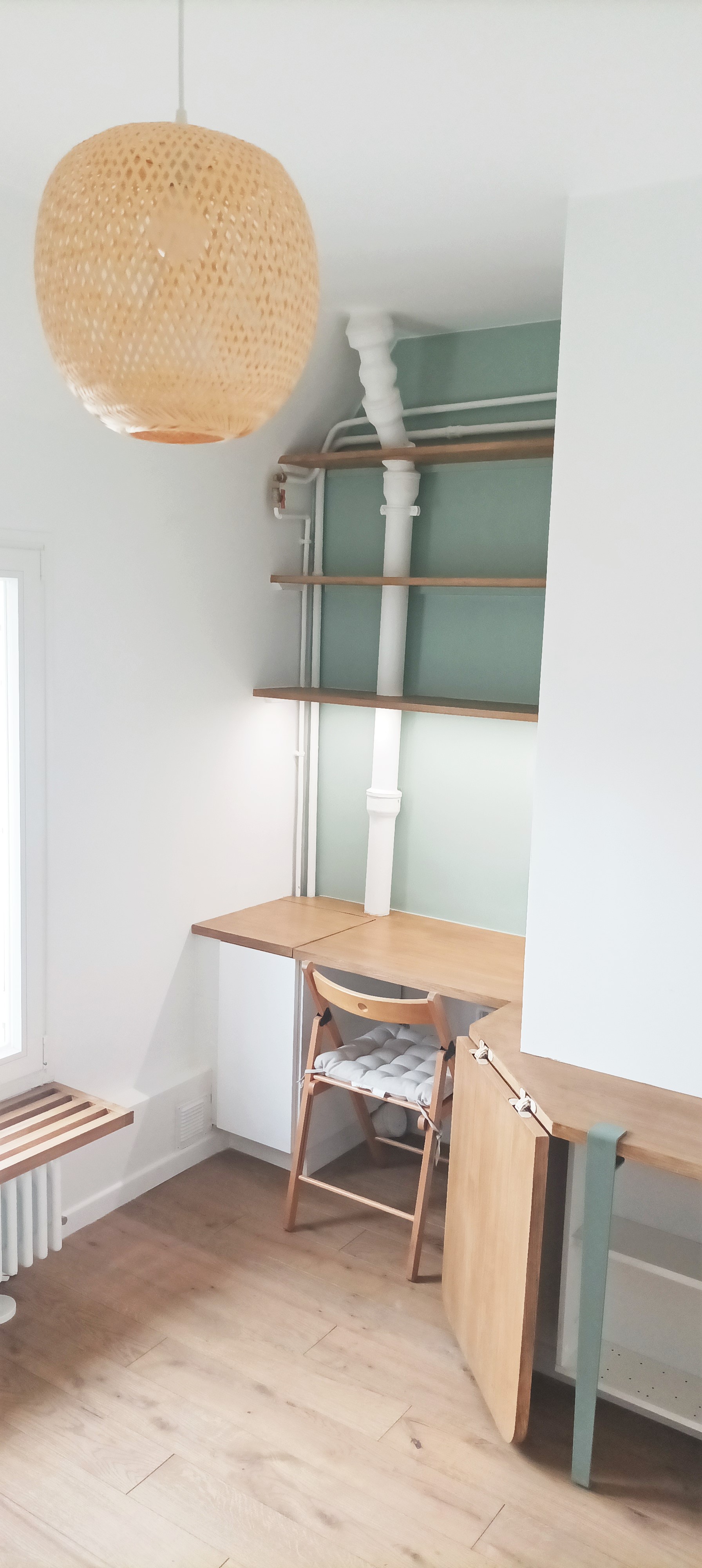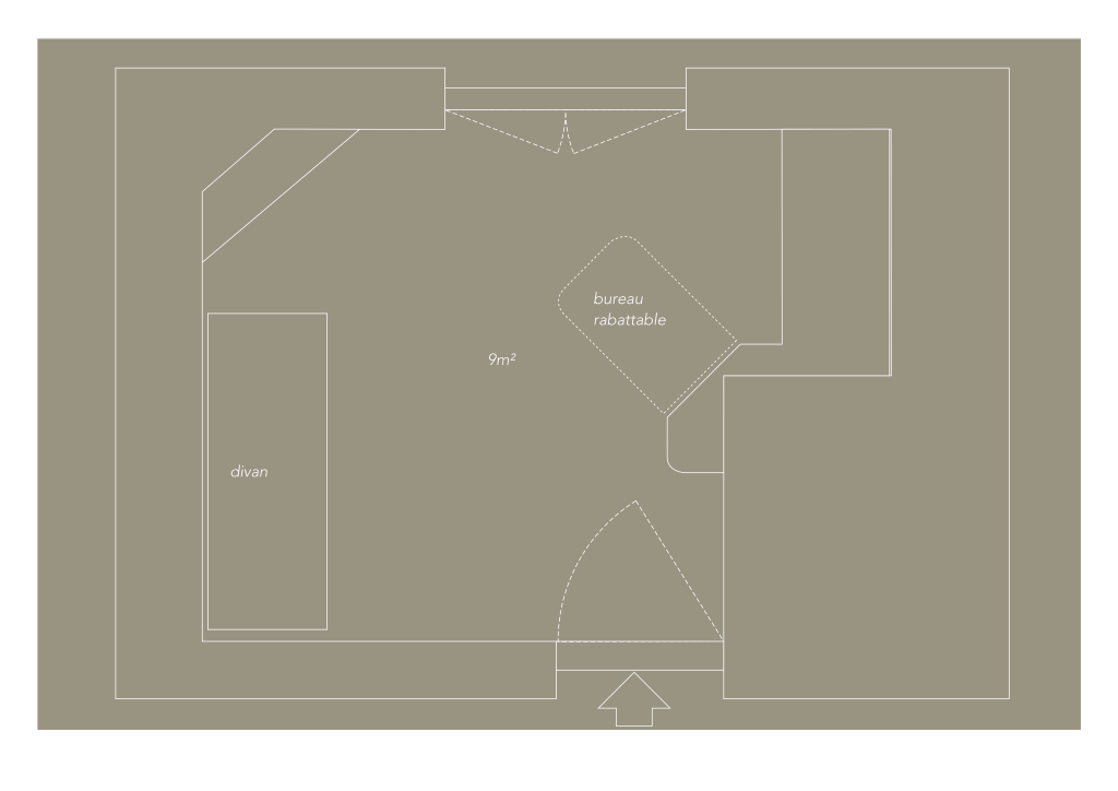 Une psychologue avait besoin d’aménager une chambre de 9m² dans un immeuble des années 40 à Paris, afin d’en faire son cabinet. L’espace devait remplir plusieurs conditions nécessaires à la thérapie incluant une étagère de jeux et un espace de dessin pour les enfants, un divan et un fauteuil pour la patientèle adulte, ainsi qu’un bureau pour ranger ses documents, préparer et synthétiser les consultations. De plus, la pièce devait comporter un point d’eau discret pour permettre un lavage de mains facile et rapide entre deux consultations ou se préparer un thé. Bien que la pièce soit exiguë, l’aménagement devait permettre une circulation fluide et être modulable en fonction des besoins de la thérapeute.