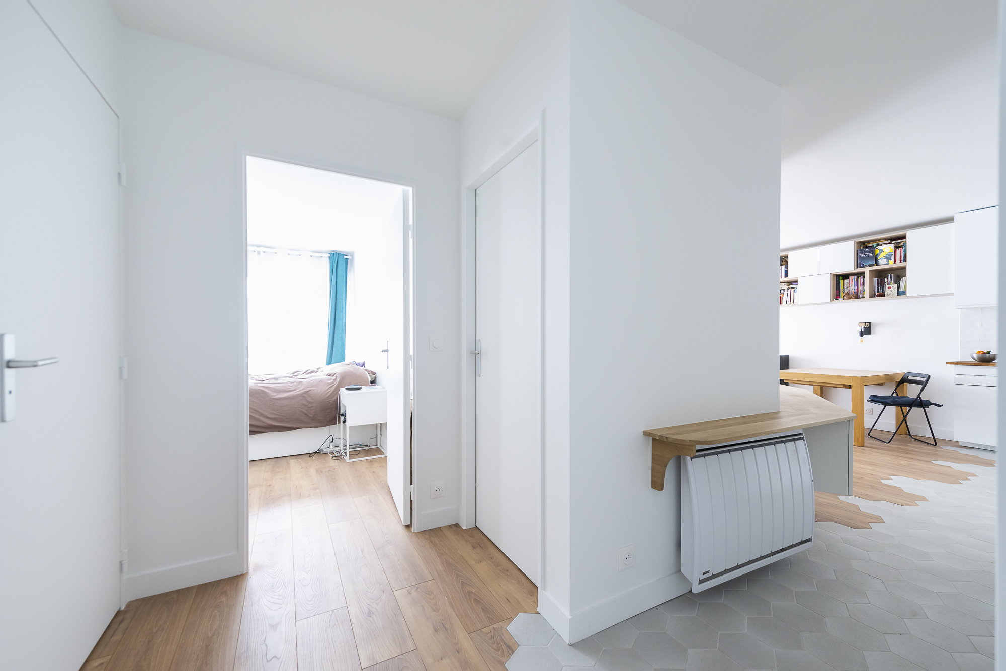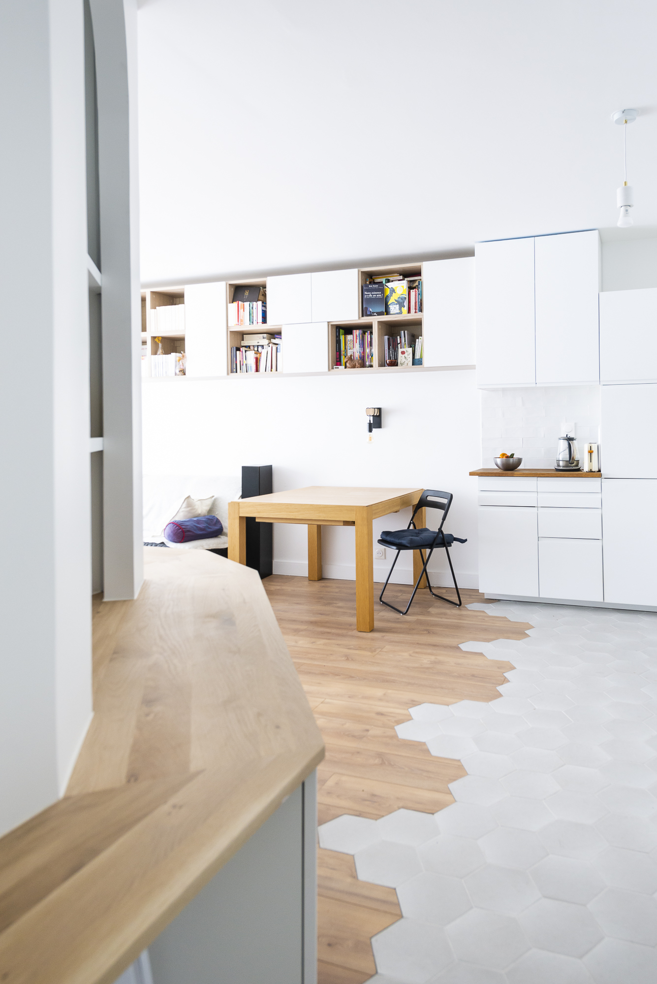 Le revêtement de sol a été complètement repris avec l’installation d’un parquet et de carreaux hexagonaux depuis l’entrée jusque dans la cuine pour séparer les espace.