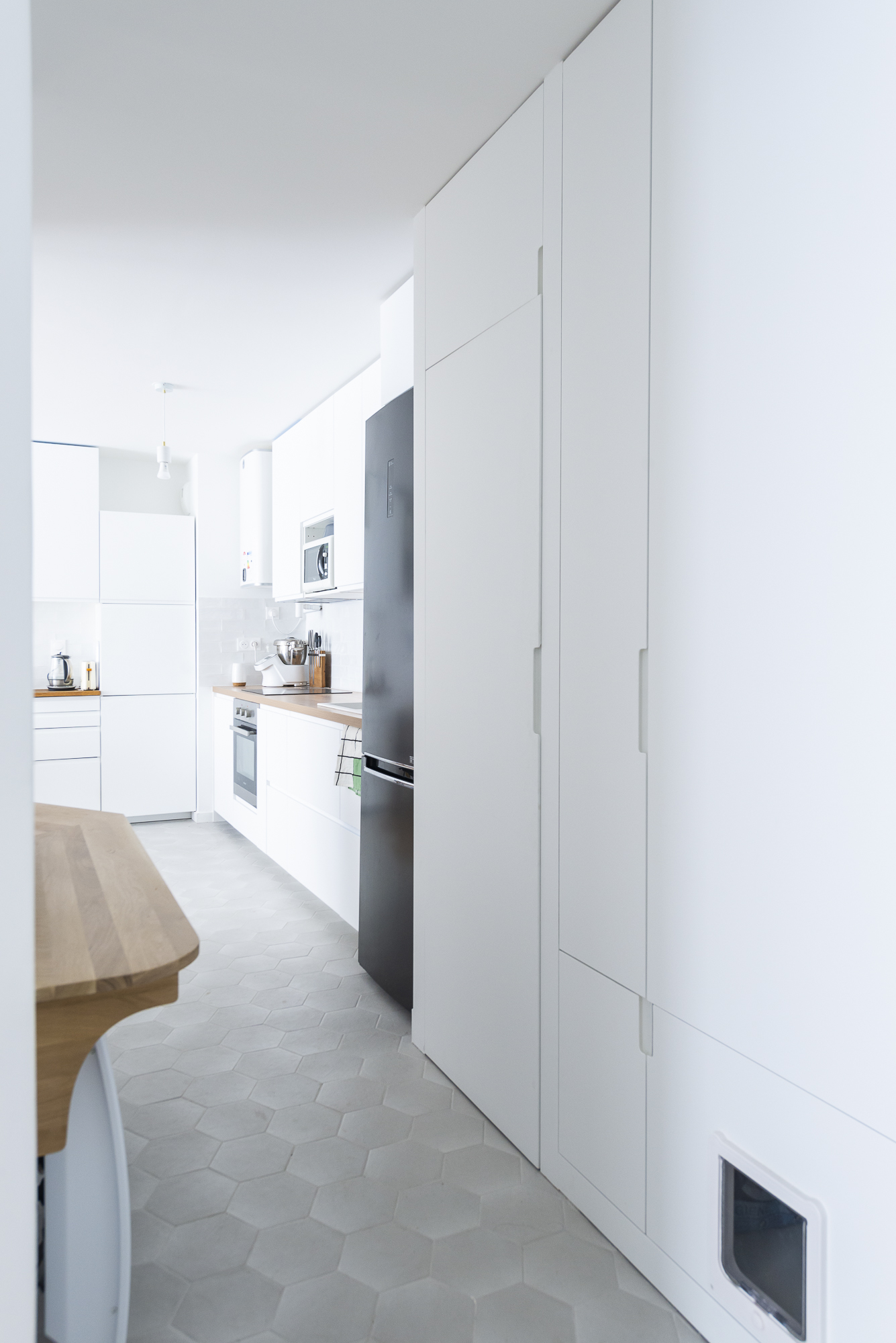 Afin d’optimiser l’espace, j’ai ouvert l’entrée et la cuisine, donnant ainsi une sensation d’espace et de fluidité entre les différentes pièces. J’ai également créé une alcôve dans un angle perdu pour maximiser la surface habitable, tout en apportant du charme à l’appartement. Pour répondre aux besoins de rangement, j’ai installé plusieurs caissons issus de la grande distribution recouvert d’une console en chêne massif qui entoure la nouvelle pièce pour en souligner le volume.
