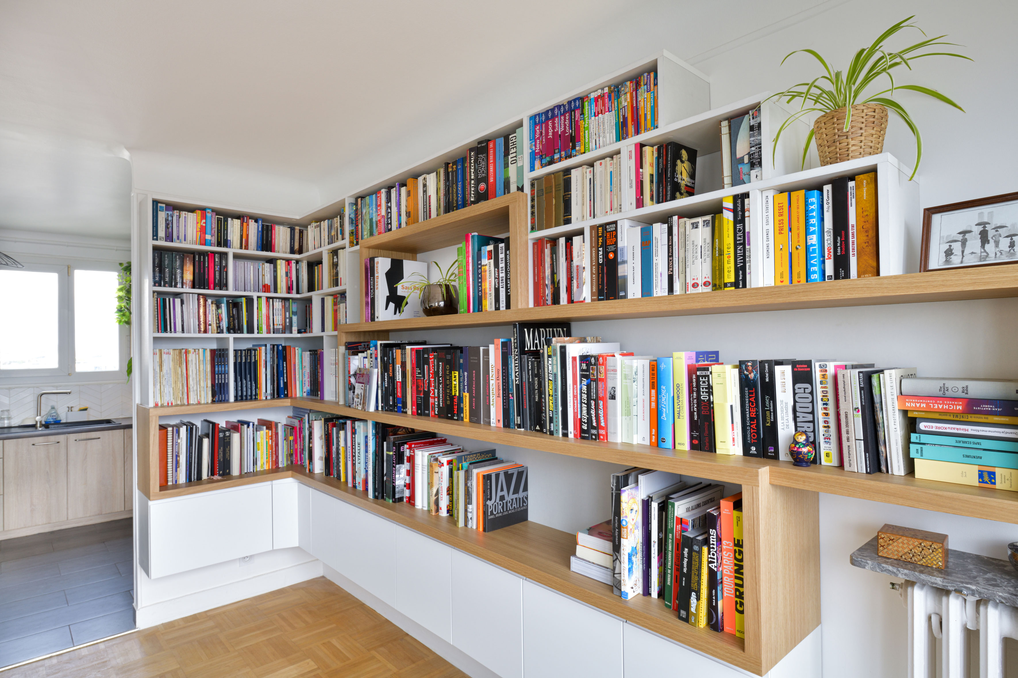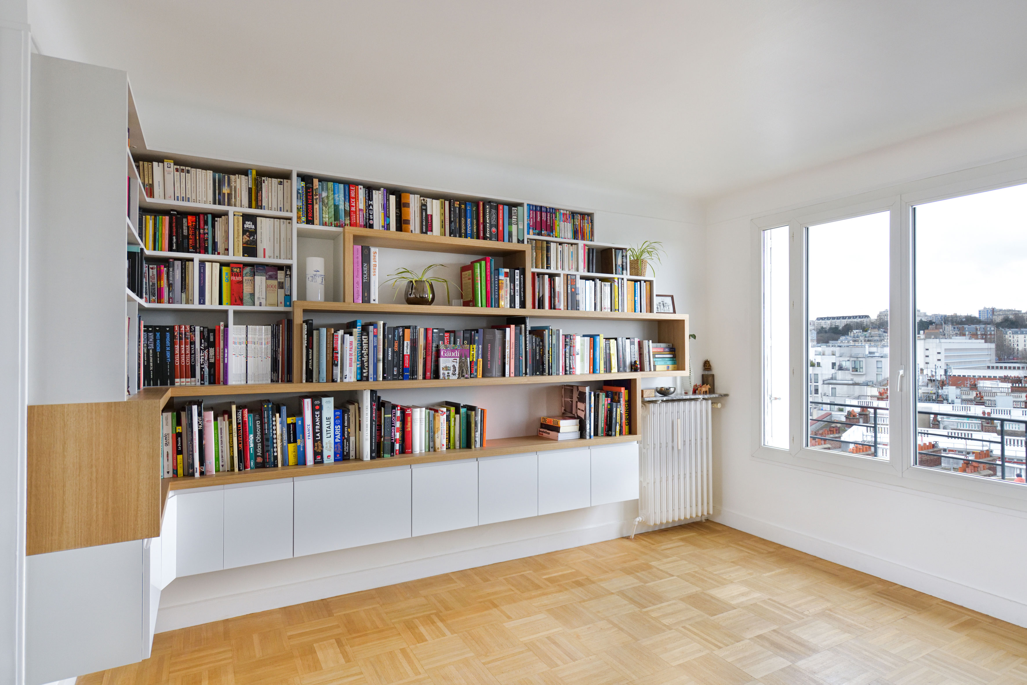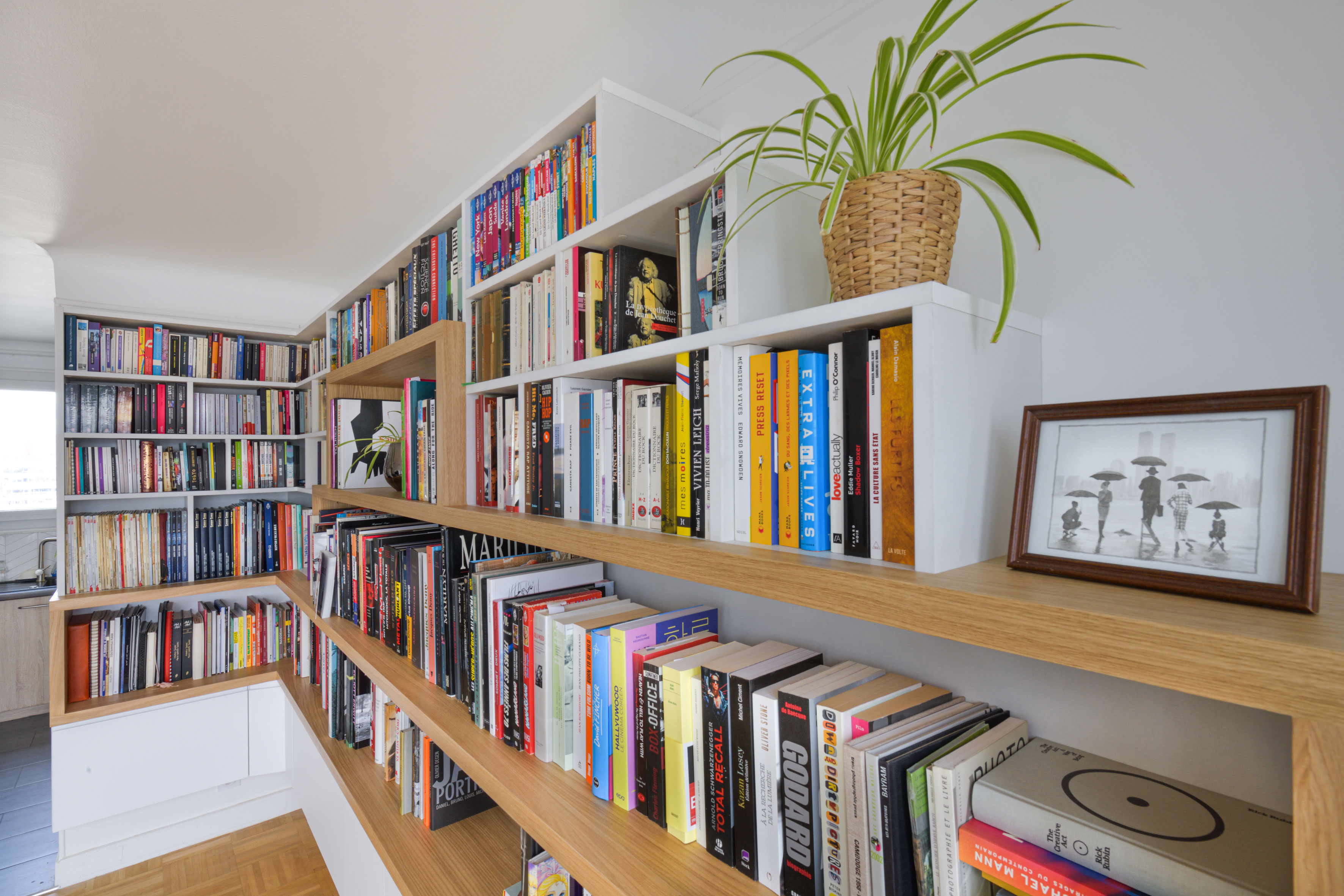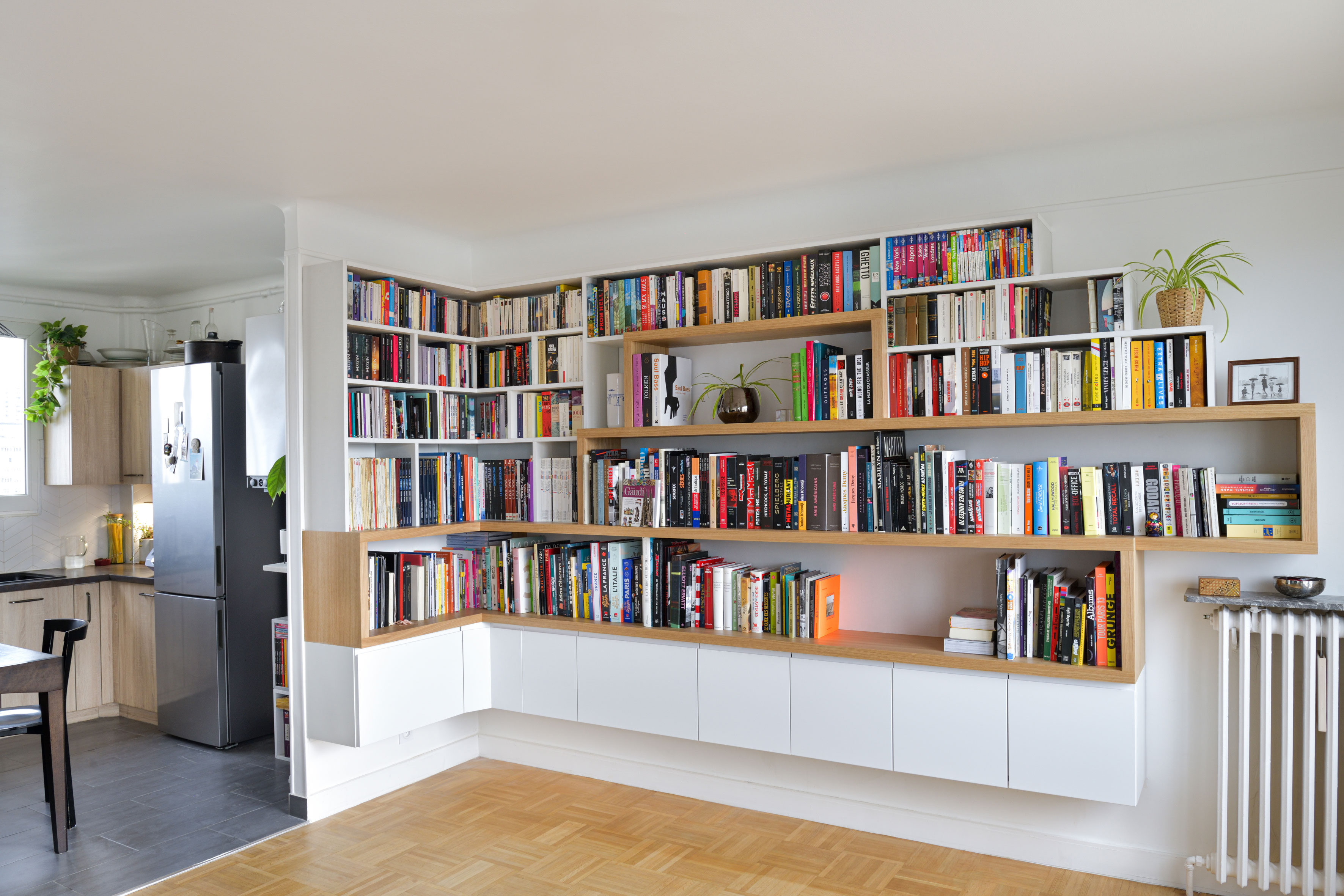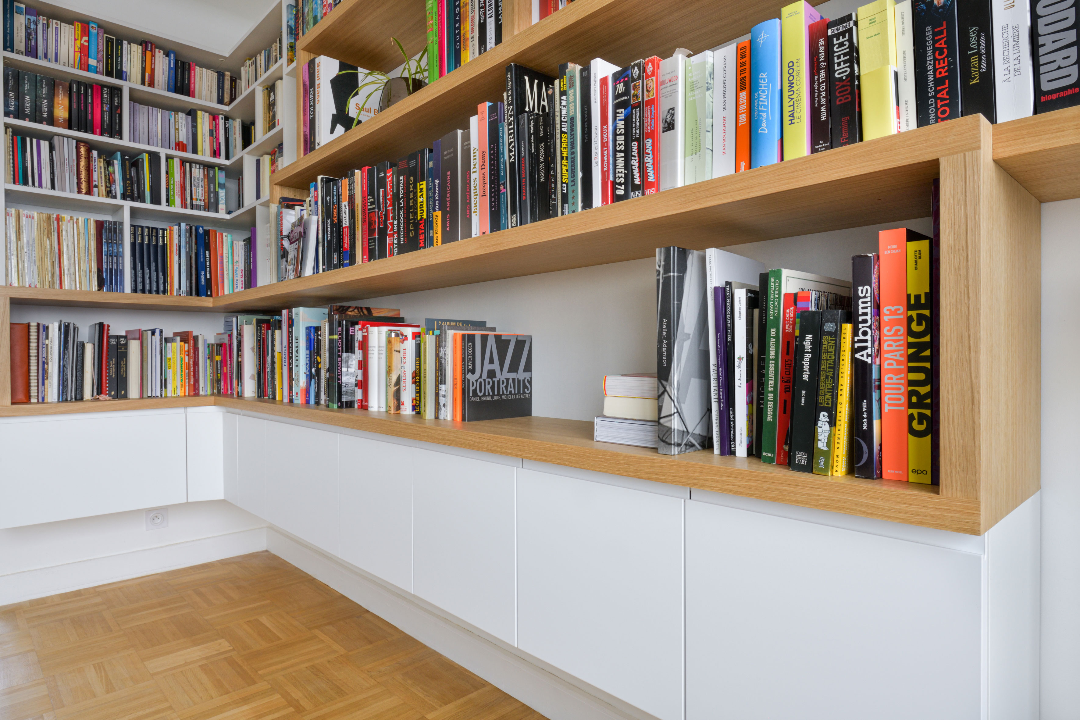 Benjamin et Sophie ont récemment rénové leur appartement, mais n’arrivaient pas à s’y sentir parfaitement chez eux sans la pièce maîtresse de l’appartement : une belle bibliothèque de 28 mètres linéaires pour accueillir leurs nombreux beaux livres, guides de voyage et bandes dessinées. Il fallait également rendre accessible, mais invisible, leur impressionnante collection de DVD, que j’ai choisi de discrètement stocker derrière des tiroirs sous le meuble.