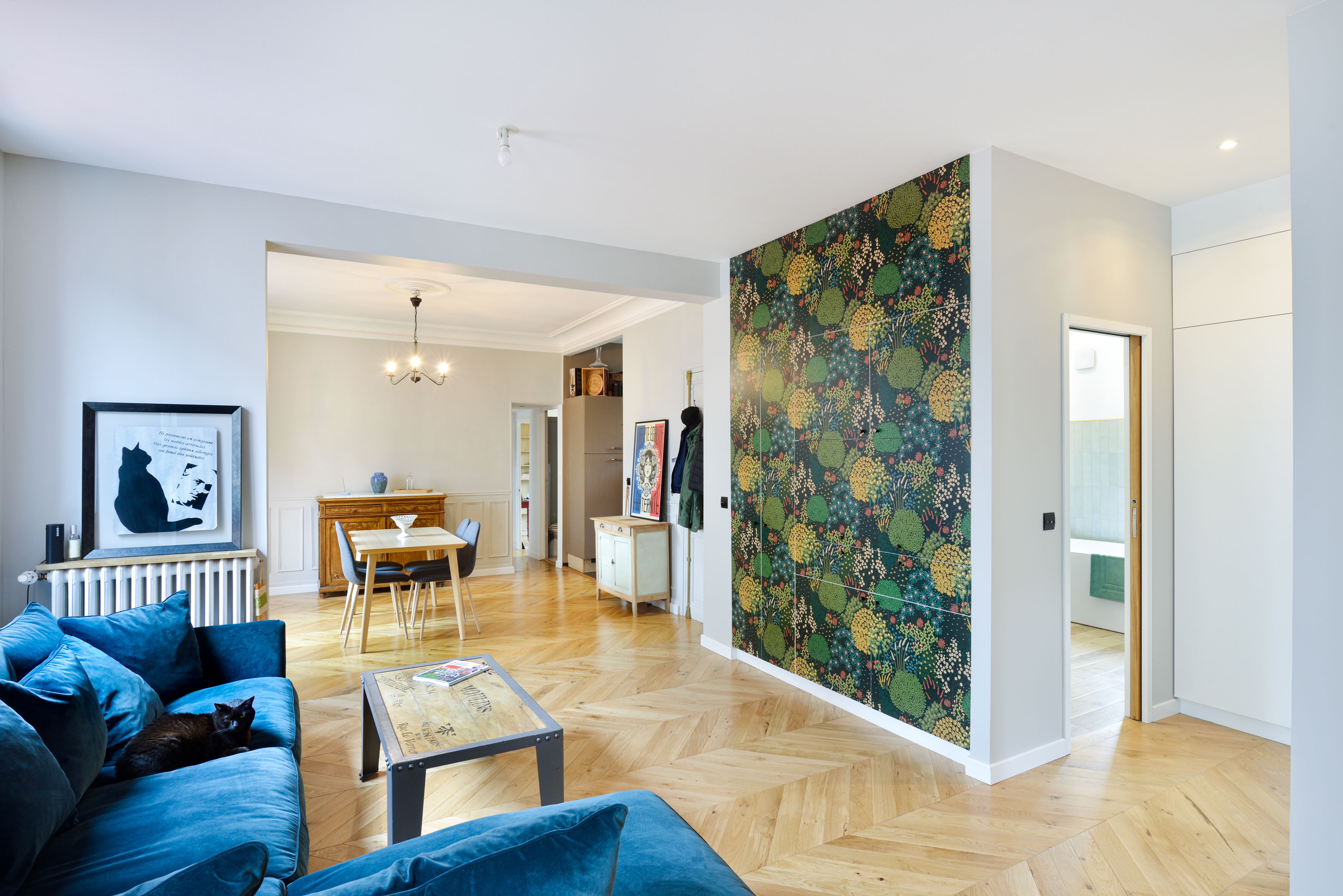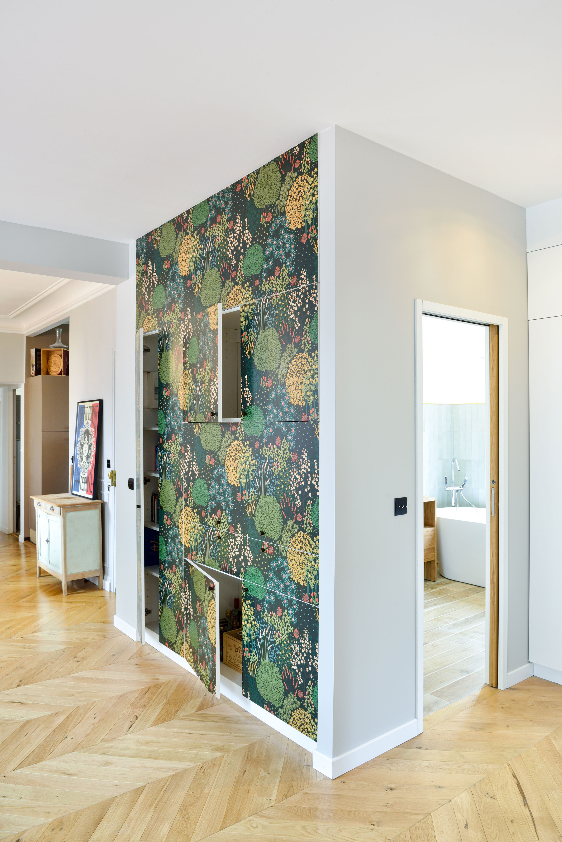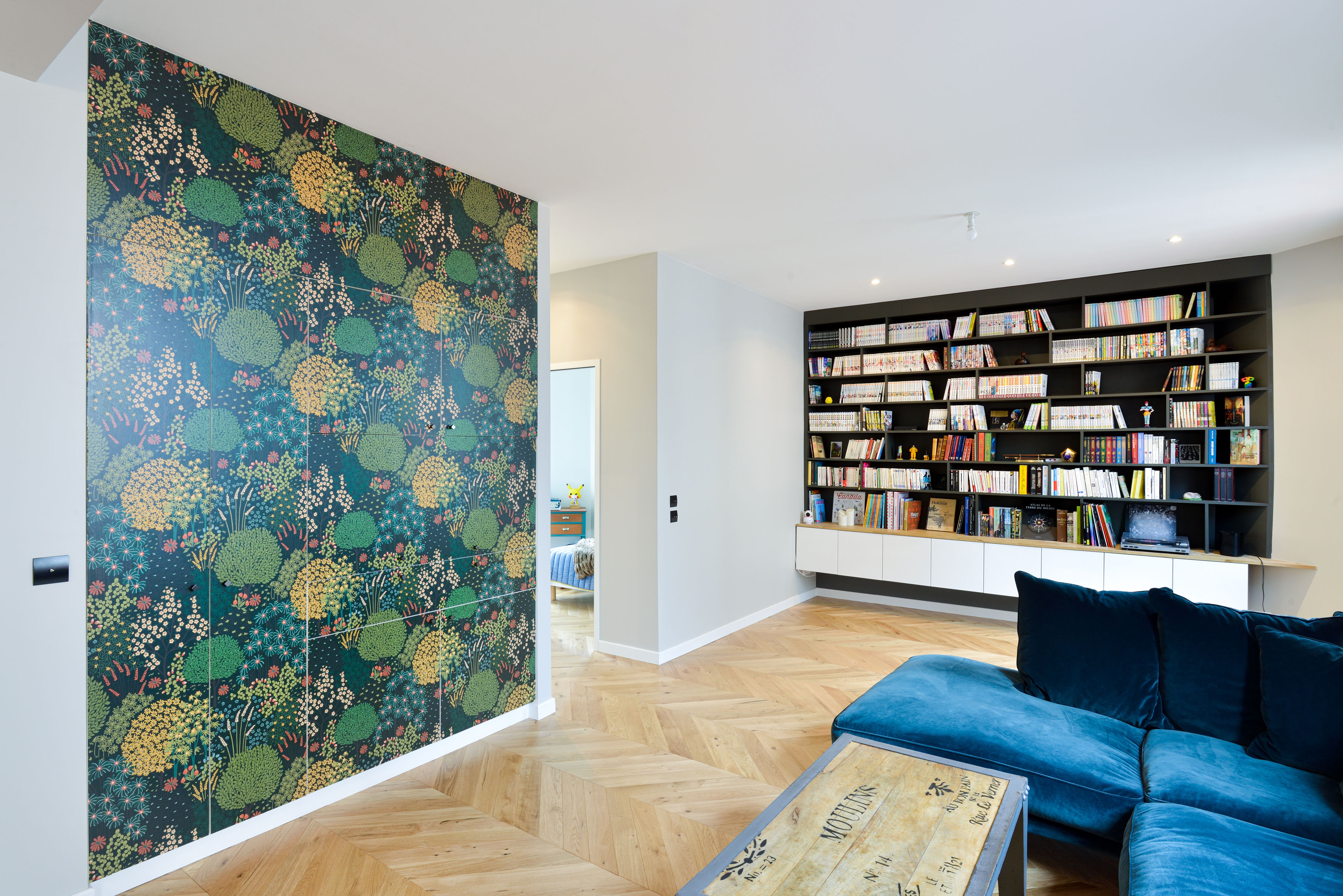 Arnaud et Arthur ont eu l’occasion d’acheter l’appartement voisin et ainsi de doubler leur surface d’habitation, d’ajouter une chambre d’amis avec salle de bain indépendante et d’ouvrir leur séjour sur une salle à manger et d’un grand espace de lecture.